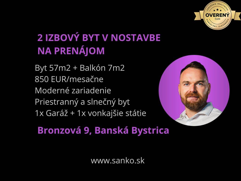 1 x nájomné vo výške 850 EUR (vrátane energií, optického internetu, Magio TV a 2x parking)